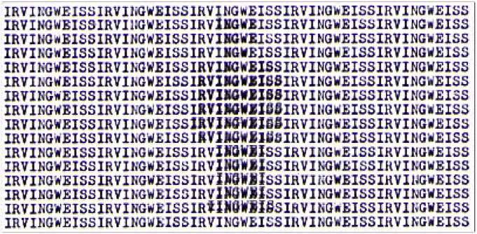 Irving Weiss’s writings include visual and word poems, fiction, essays, translations, and reviews, published in anthologies and in general and literary magazines in print and online. He has given readings and presentations, joined in mail art sendings, and exhibited mounted prints of his visual poems.